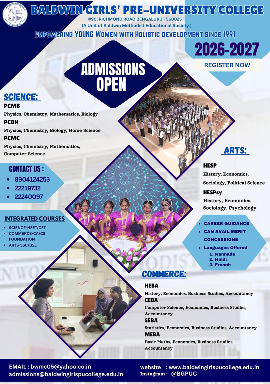 Baldwin Girls’ PU College, A Unit of Baldwin Methodist Educational Society, is managed by the Methodist Church in India. Bishop of the South India Regional Conference is the Chairman of the Board of Governors.